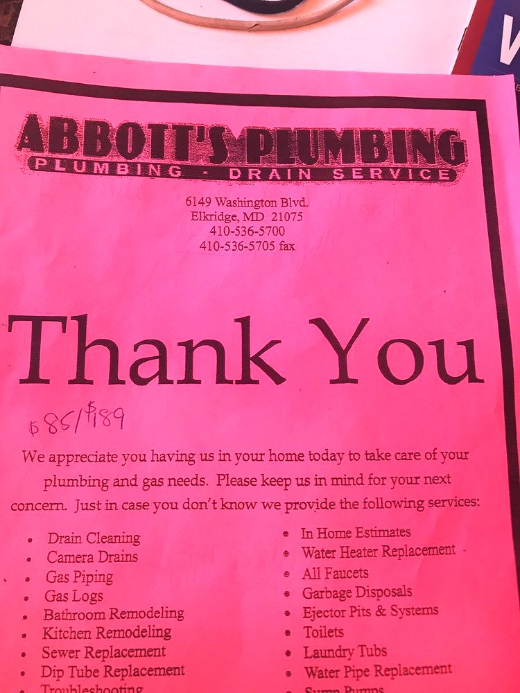 Plumbing is the best plumbing company in Baltimore region. Their staff understands their trade out and inside and is professional. They leave the house cleaner than when they arrived. I'm comfortable leaving them access to the house when I am not dwelling. Abbotts is the company!