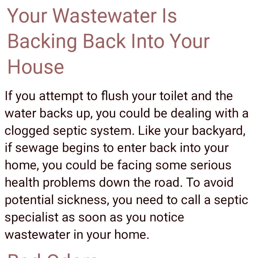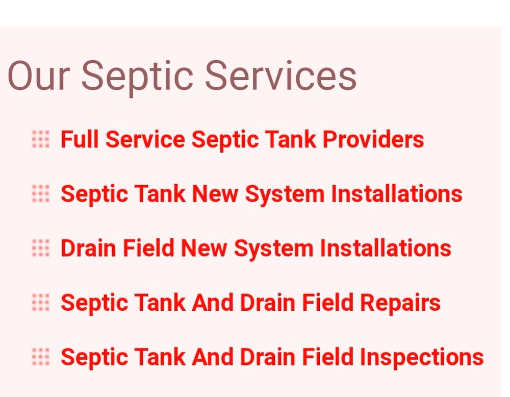 We can diagnose and resolve your septic problems all. I'd indicate that we come by and start your own tank and that will tell us what if you are experiencing problems. From there we could attack the problem with no customer! Our job is to help save money and to maintain septic waste confined into a septic tank and drain field. Symptoms of a system are water bubbling sounds on your bathroom and draining from the bathtub or toilet. Waste water in your pipes line or water on the ground near your septic tank will be signs that something isn't right. You need to clean your tank once every three to four years or have it inspected. We will do what is required to address your problem and are honest people. So give us a call satisfaction guaranteed!!! Our solutions include Cleaning your tank, setup and repair of drain fields, unclogging of pipes components, installation of plumbing lines and any other issues involving your septic tank.