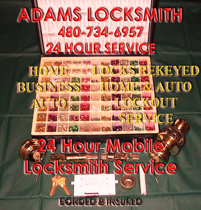 With almost ten decades of experience in the locksmith trade, Adams Locksmith technicians are trained, bonded and insured to meet with your emergency locksmith needs twenty-four hours a day, everyday. Adams Locksmith was established out of the need for re-key providers and quick lockout in the northeast valley. Serving Mesa, Paradise Valley, Carefree, Northeast Phoenix, the Scottsdale and Tempe, Adams Locksmith supplies the convenience of free quotes and hour service. Facing a home security violation or a lockout isn't the opportunity to be haggling over prices. Adams Locksmith will arrive onsite prepared to restore access at a price. If you have time to get a free estimate, Adams Locksmith will be delighted to estimate your lock difficulties and determine what it will cost to restore your sense of security. It's time to call somebody in securing your property straight away, just like Adams Locksmith who understands the urgency. Whether it is your keys dangling from inside the uncertainty of how many strangers have keys for your home or a locked car, Adams Locksmith will arrive night or day to restore order for a world. General Scottsdale Locksmith Services Adams Locksmith can tackle your other basic locksmithing While helpful in a crisis situation needs. Adams Locksmith will gladly retrieve your keys from a locked car or rekey your door locks after a transfer, but you will find other lock services that we can offer for example: In Scottsdale, Paradise Valley, Carefree, Northeast Phoenix, Mesa and Tempe call Adams Locksmith in 480-734-6957 anytime for quick, friendly and skilled locksmith services.