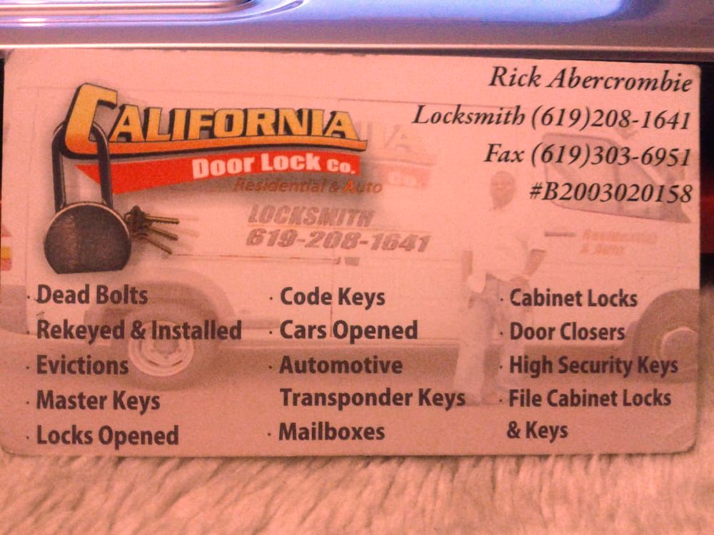 With over 35 Years in the business California Door Lock Company is Your go-to for Anybody with Lock or Door needs. Let our Professionally trained and licensed team serve your locks, doors, and particularly you!