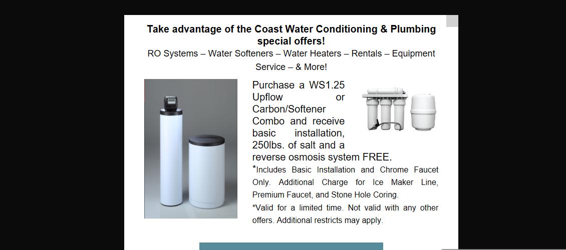 Coast has been servicing my aging water softener system for a few years. It would be simple for them to sell me an expensive replacement unit, but rather they work (and honestly) to fix the unit and keep it functioning as long as possible. It seemed like it would be the conclusion of the life of the unit, but the technician took the unit back to the home office just to be sure. That night when I came home, the unit was back in place and running. Price $20! Wonderful SERVICE. It really does not get any better than that.