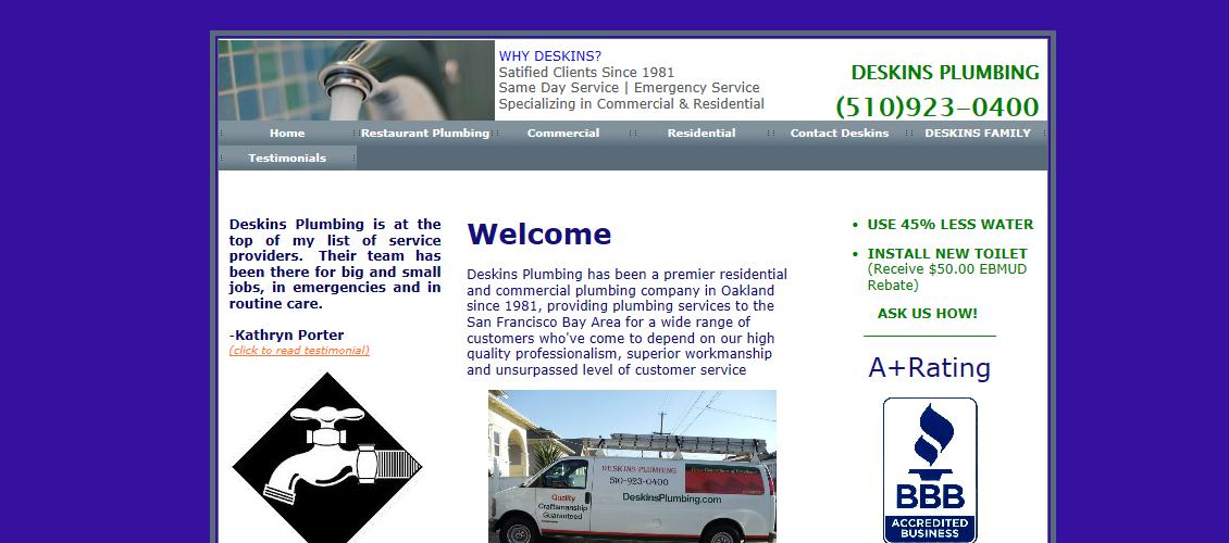 Deskins Plumbing is a premier residential and commercial plumbing business in Oakland since 1981, providing plumbing services into the San Francisco Bay Area for a vast assortment of consumers who have come to rely on our high excellent professionalism, superior workmanship and high level of customer services. We are a honest and fair plumbing business that's licensed, bonded, and insured. We do quality work and we use only quality stuff. All work matches and the majority of time exceeds the criteria of the California uniform plumbing code. All work is backed by a one year parts and labour warranty regardless if components manufacturer warranty is less. We are a family, local, and minority owned business.
