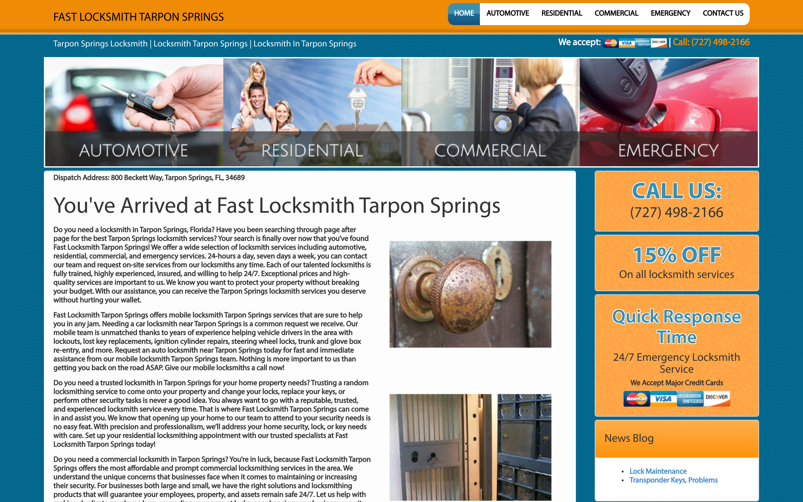 I called Fast locksmith of Tarpon Springs and obtained a dispatcher in St Petersburg Fl