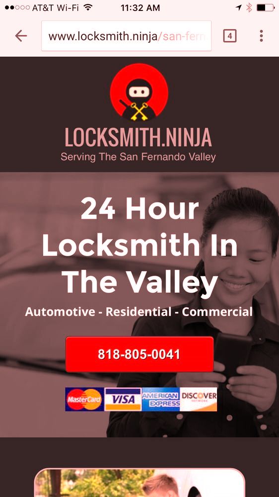 So I google Locksmith Sun Valley California and up pops Locksmith Ninja. So I call and she answers the telephone,"Locksmith". So I confirm,"Can this Locksmith Ninja?" She says yes and asks for telephone and my name in case we get disconnected. I give it to her.