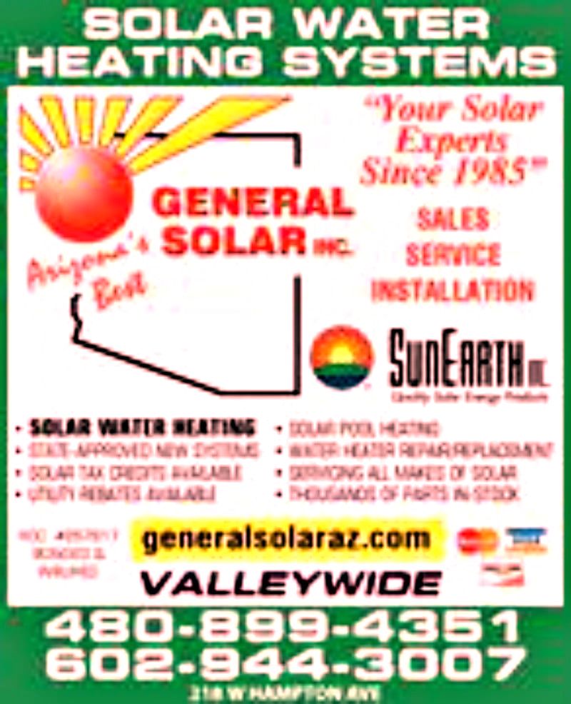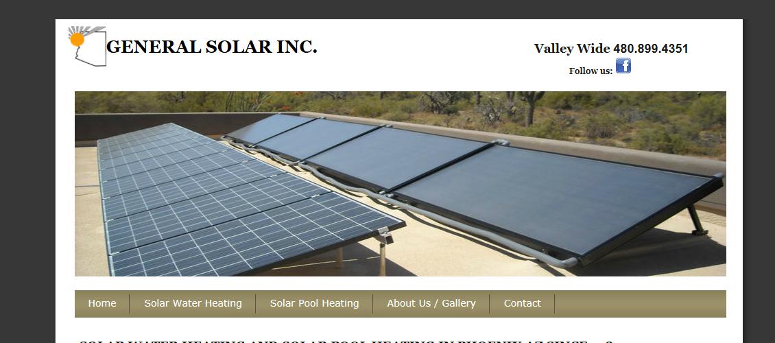 SERVICE ON EXITING UNITS With tens of thousands of solar units throughout the valley, many units could use maintenance. We are certified to operate on all sorts of solar water heaters including glycol units and forth loop, drain back. Because we stock nearly all types, water heater storage tank replacement is not a problem. So there is not a requirement to special order parts in, We're backed by a warehouse of specific parts. Many times a simple repair may keep a solar water heater working trouble free. Contact General Solar Inc. for information about solar water heatingsystem, including our organization and solar pool heating. Solar water heater Phoenix, solar water heat, solar hot water heat, Phoenix water heater, solar heating panels, Phoenix solar water heater, solar hot water, solar, solar Phoenix, Phoenix AZ solar, solar power, solar heating Arizona, solar heating Gilbert, solar heating Mesa, solar water Tempe, solar water Scottsdale, solar pool heating Phoenix AZ, solar water heating Phoenix AZ, solar water heating Phoenix Arizona, solar pool heating phoenix Arizona.