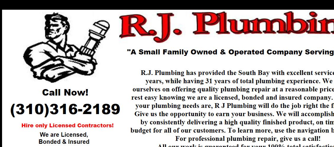 -LRB-310-RRB-316-2189 R.J. Plumbing has supplied the South Bay with exceptional service for 28 years, while having 31 years of overall plumbing experience. We pride ourselves on offering quality plumbing repair at a price that is sensible. You can rest easy knowing we are a licensed, insured and bonded company. For plumbing repair, give us a call!All that our job is guaranteed for your complete satisfaction that is 100%. We're exceptional at Water Heater replacement & repair! Free phone estimates. Beginning at $2,499**We offer free estimates within service region. Tankless Water Heater Specialists!Has your Tankless Water Heater been"Descaled"? All Tankless Water Heater company's suggest descaling units regularly. Attention!!! As a result of extreme hard water from the bay, scale inducing and is currently forming pin hole leaks in copper pipes! To combat this we suggest installing a Nuvo water heater program for your entire house. It is a terrific choice to salt based goods.